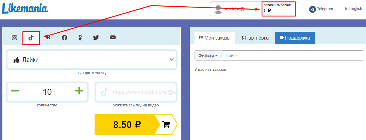 Likemania – удобный сервис накрутки, который работает с самыми популярными соцсетями, в том числе TikTok. Пользоваться им очень просто. Для регистрации нужно только ввести адрес электронной почты или авторизоваться, используя свой аккаунт в любой социальной сети.