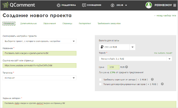 Шаг 3. Заполняете все необходимые данные для выполнения задания. Вверху ещё есть дополнительные вкладки.