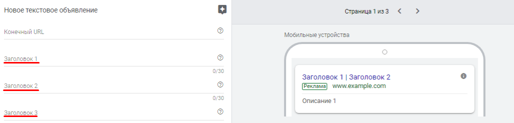 В Google Ads в объявлениях для кампаний на поиске доступно три заголовка. Ограничение размера для каждого — до 30 символов.