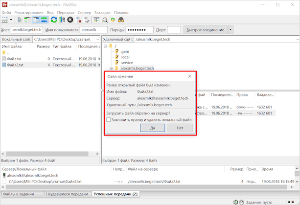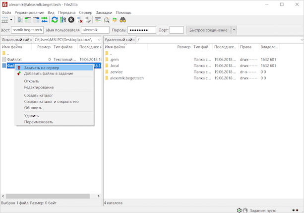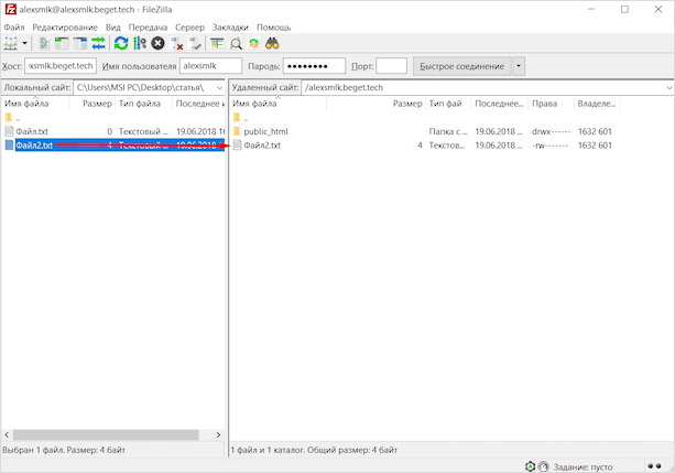 При подключении к удаленному серверу мы можем передавать файлы туда и обратно. Самый простой способ сделать это – перетащить его, зажав левую кнопку мыши.