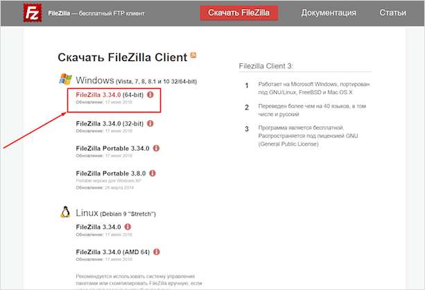 После того, как мы нажмем на “Скачать FileZilla”, нас сразу кинет на страницу загрузки, где будут доступны версии для разных операционных систем.