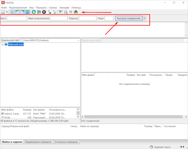 Все они у нас есть (скриншот выше), у вас они будут свои. Вводим данные в соответствующие поля в Файлзилле и нажимаем “Быстрое соединение”.