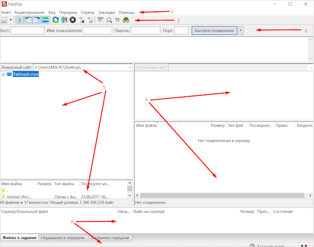 Более подробно остановимся на интерфейсе FileZilla. Хоть он и предельно прост, для новичков это может быть немного сложно. Сама Файлзилла (ее основное окно) делится на 6 составляющих. Каждая из них важна и отвечает за определенное действо.