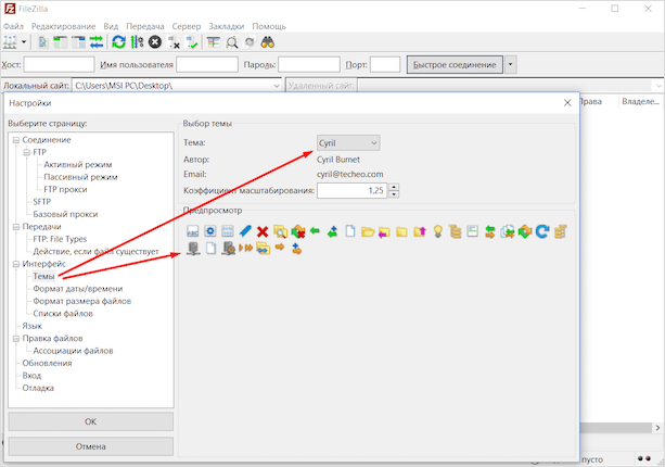 Здесь же, чуть выше, вы можете изменить тему иконок, формат даты и времени и многое другое. В стандартной настройке FileZilla вполне себе юзабельна: вы легко можете подключиться к хосту для передачи файлов. Особой настройки это не требует, все интуитивно понятно и просто.