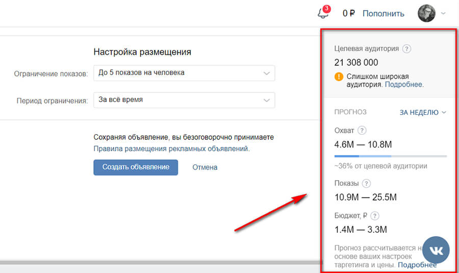 Как и при любых настройках таргетированной рекламы в ВК справа отображается панель, где можно посмотреть прогнозируемый охват, показы и бюджет.