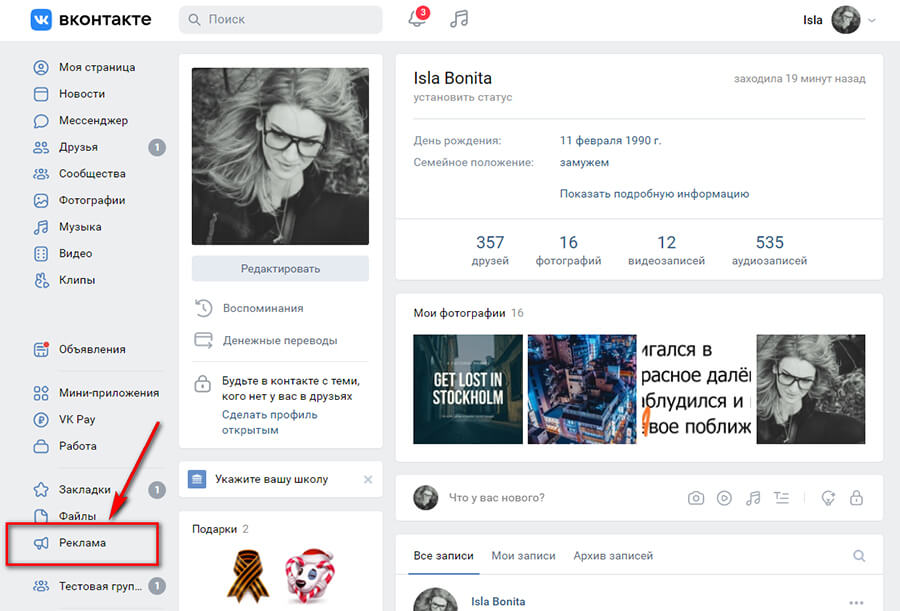 Шаг 1. Чтобы создать объявление идем в рекламный кабинет ВК — сейчас его можно найти на странице профиля в левой панели меню. Раздел так и называется — Реклама.