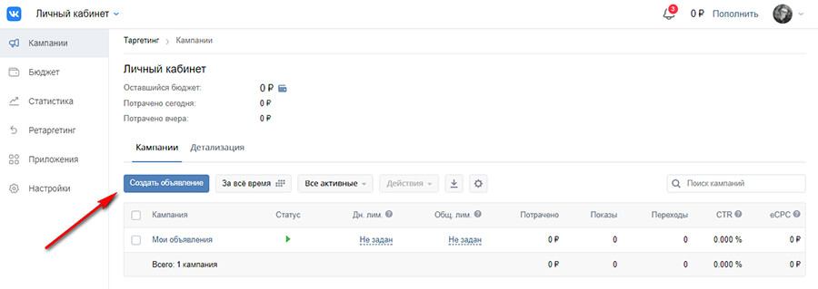 В личном кабинете рекламного кабинета жмем «Создать объявление».