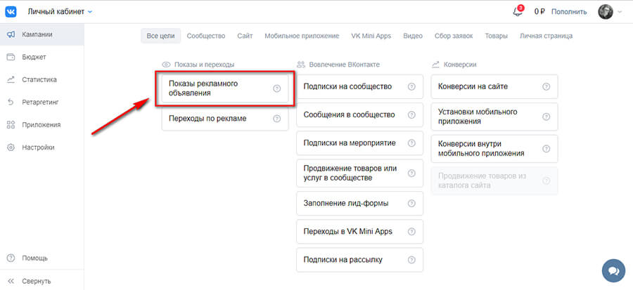 Шаг 2. Выбираем цель рекламы — есть 12 вариантов и один по заявке, он доступен не всем рекламодателям (продвижение товаров из каталога сайта).