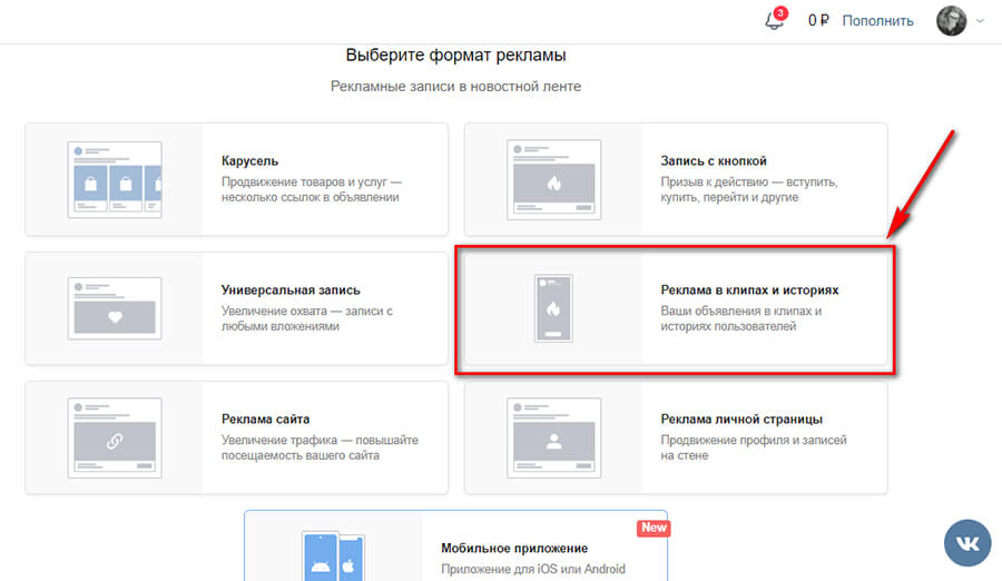 Открываются варианты рекламных форматов. Выбираем, соответственно, «Реклама в клипах и историях».