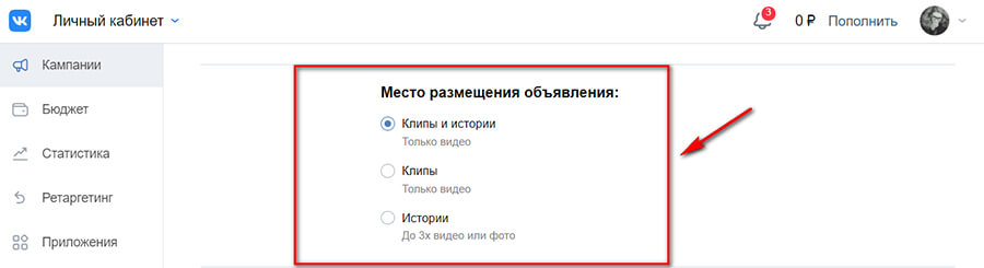 Если хотите запустить рекламу и в историях, и в клипах, то лучше сделать две РК, отдельно под каждое место размещения. Так лучше делать с точки зрения дальнейшего анализа эффективности рекламы.