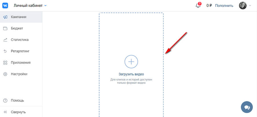 Шаг 4. Загружаем видео — для клипов можно запускать рекламу только через видеоформат. Креатив для рекламы в Клипах должен быть вертикальным.