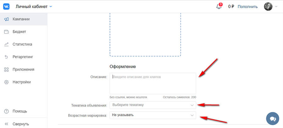 Под видео может быть небольшое описание (до 200 символов). Также можно указать возрастное ограничение и тематику видео, чтобы оно охватывало ЦА, а не всех подряд.