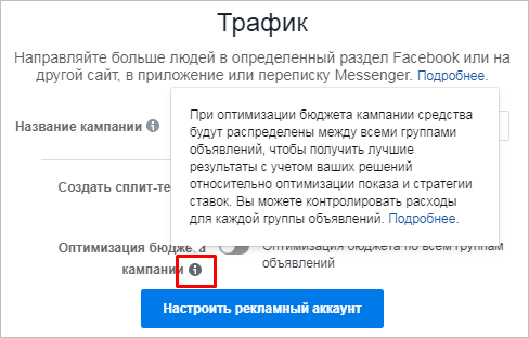 Сразу может быть сложно разобраться во всех тонкостях, для этого нужно время и практика. Рядом с конкретными настройками в Ads Manager есть подсказки в кружочке с восклицательным знаком.