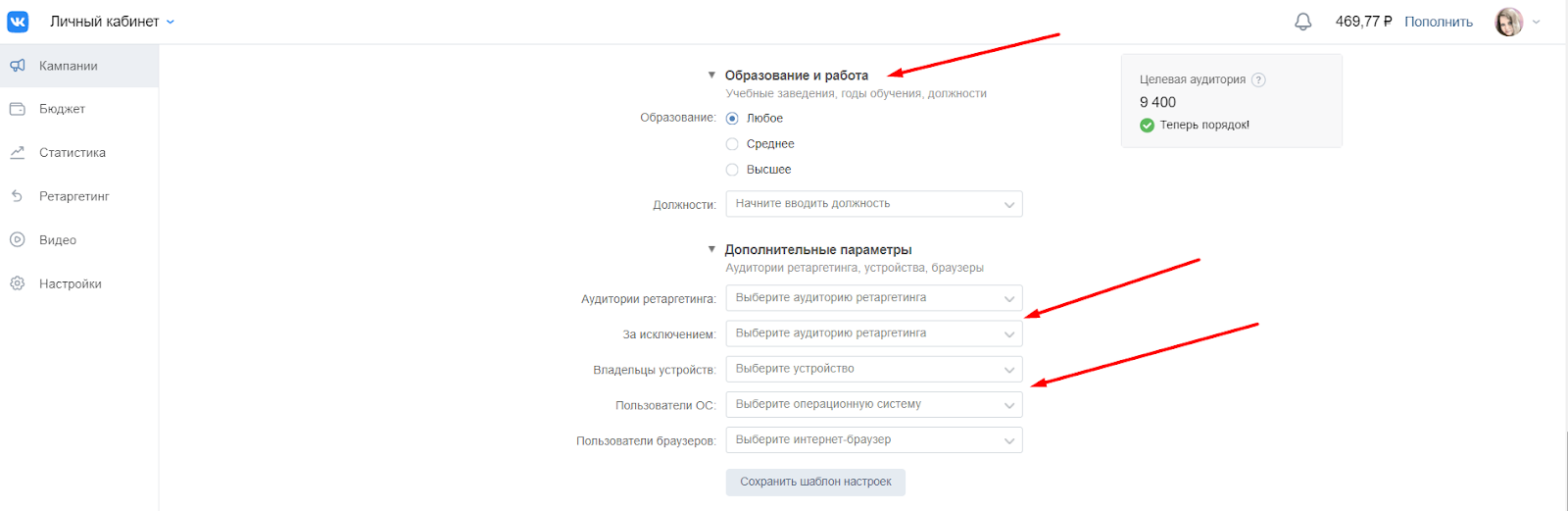 Задав все условия подбора аудитории, можно сохранить шаблон настроек, чтобы использовать его в других объявлениях и кампаниях.