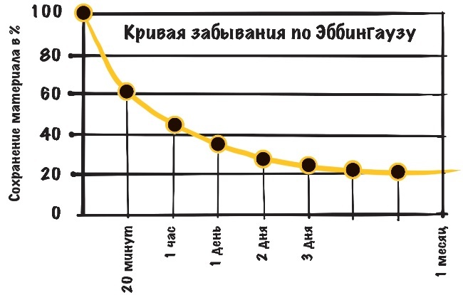 Далее процесс забывания продолжается, хоть и не так стремительно. В итоге через месяц в голове остается около 20 % полученных знаний. Повторение помогает замедлить процесс и обмануть кривую забывания.