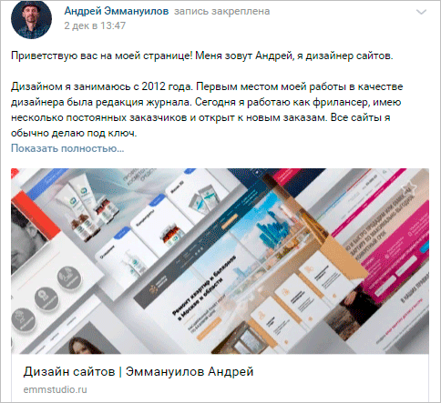 Кроме того, в закрепленном посте он представляется веб-дизайнером и рассказывает о достижениях, ссылается на свой одностраничник.