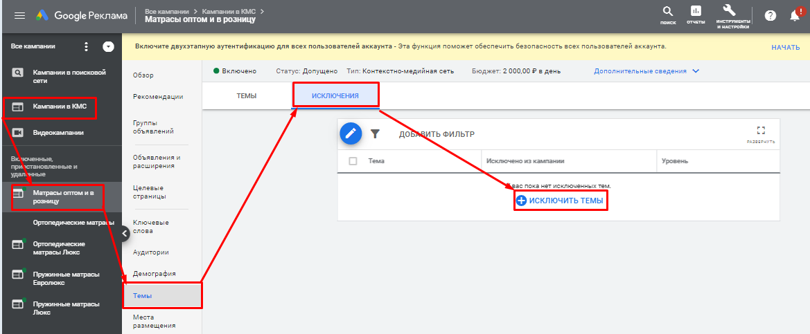 В Google Ads выберите кампанию в КМС. Зайдите в раздел «Темы». Выберите вкладку «Исключения» и кликните «Исключить темы».