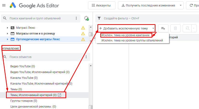Выберите в Редакторе Google Ads кампанию в КМС. В меню управления кликните «Ключевые слова и таргетинг». Выберите пункт «Темы, Исключаемый критерий».