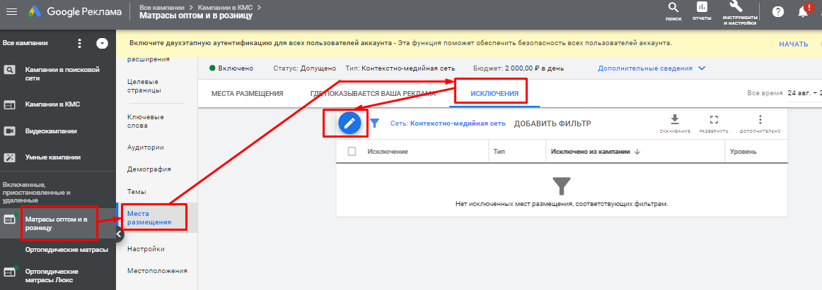 Выберите кампании в КМС для отключения показа рекламы в приложениях. В разделе «Местоположения» перейдите на вкладку «Исключения». Кликните на синий значок ручки.