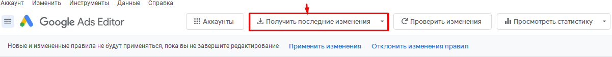 Скачайте Редактор Google Ads по ссылке и выполните первоначальную настройку по инструкции. Не забудьте получить последние изменения для всех кампаний, которые собираетесь редактировать: