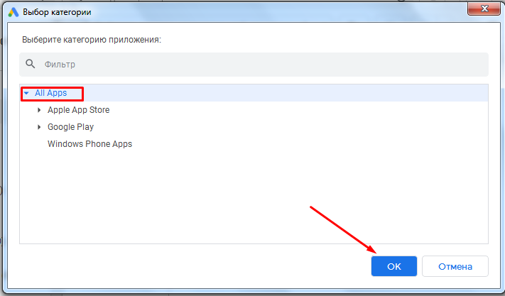 В открывшемся окне выберите «All Apps» и нажмите «OK».