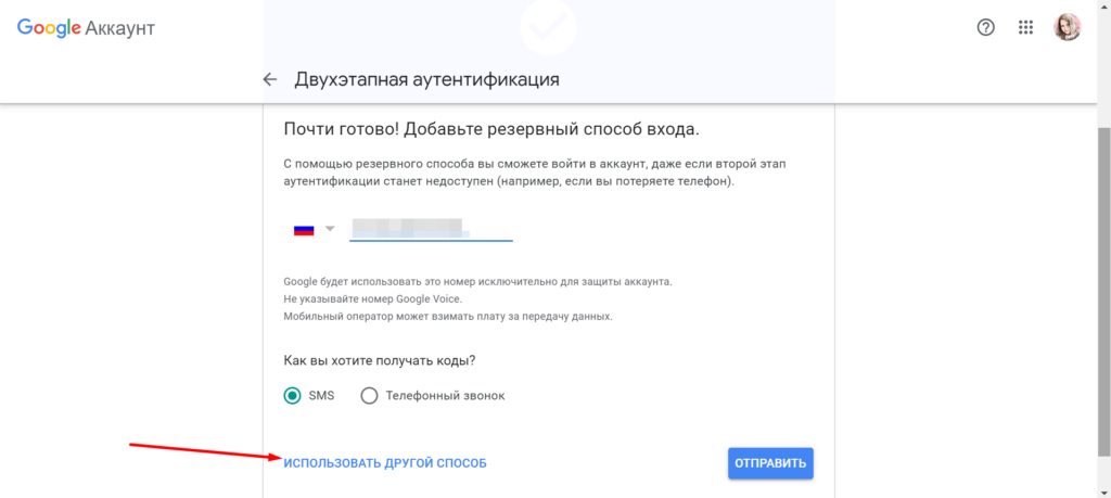 На следующем этапе останется настроить запасной способ входа на случай, если с устройствами что-то случится — по номеру мобильного телефона. Вводим номер и выбираем способ получения кода — через смс или голосовой звонок.