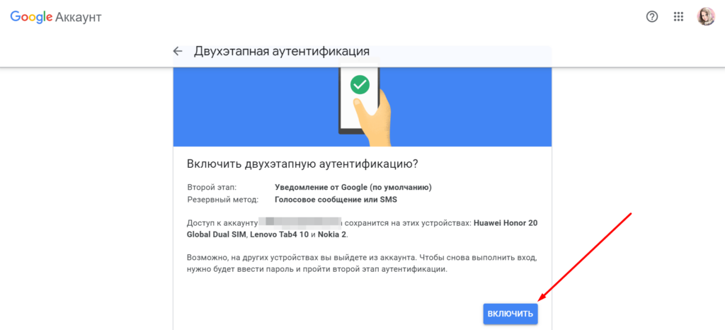 Когда аккаунт Google защищен только паролем, с помощью программы-взломщика или фишинга злоумышленник без проблем получит к нему доступ. Если же вы настроите двухэтапную аутентификацию, пароль ему ничего не даст. Чтобы войти в аккаунт и внести изменения в настройки, потребуется дополнительное подтверждение — смс-пароль, звонок или подтверждение через мобильное устройство.