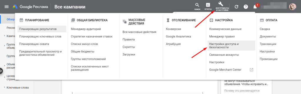 Чтобы открыть доступ, зайдите в рекламный кабинет, кликните в верхнем правом углу кнопку «Инструменты и настройки» и выберите пункт «Настройки доступа и безопасности».