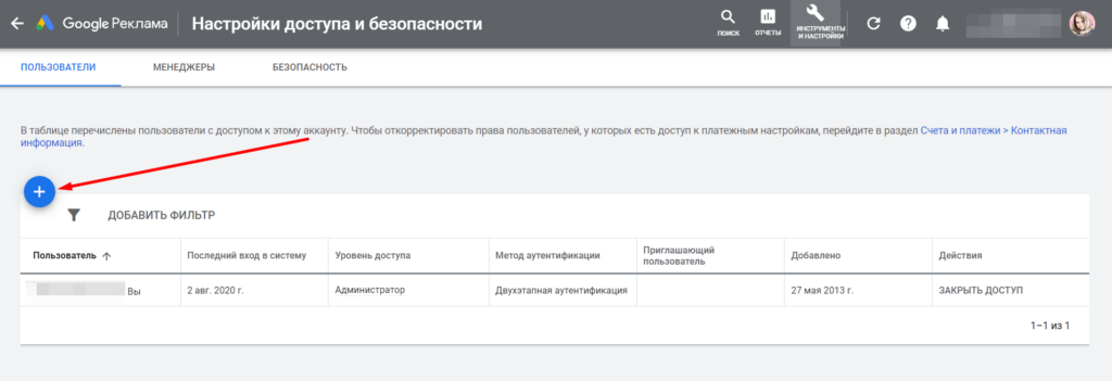Откроется таблица с данными пользователей, у которых есть доступ к рекламному кабинету. Чтобы добавить нового, нажмите «+» в левом верхнем углу.