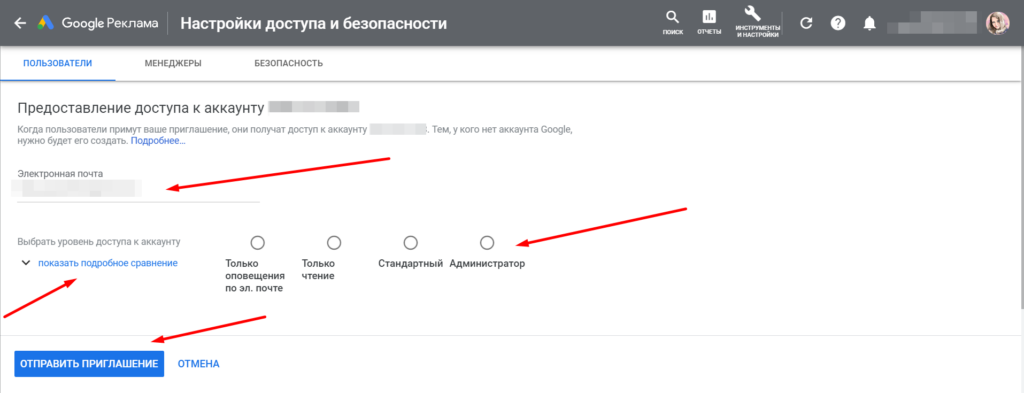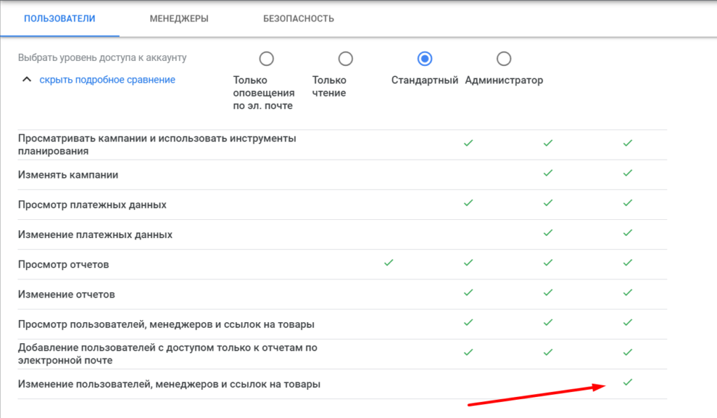 Не стоит давать доступ с правами администратора человеку со стороны. Для настройки и управления кампаниями достаточно уровня «Стандартный». С таким доступом пользователь не сможет изменить уровень или закрыть доступ вам и вашим сотрудникам.