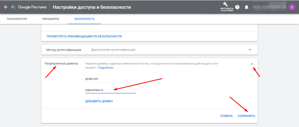 - Ограничьте почтовые домены, через которые можно заходить в рекламный кабинет.