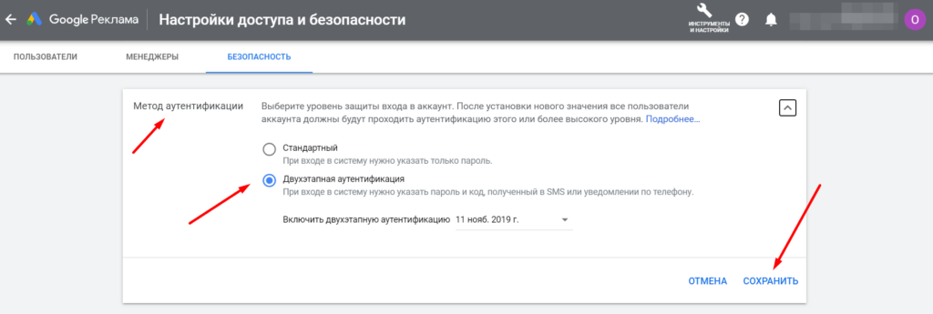 На этой же странице вы можете обязать всех пользователей, у которых есть доступ к рекламному кабинету, использовать двухэтапную аутентификацию для входа. Для этого разверните соответствующий пункт, выберите метод и кликните «Сохранить».