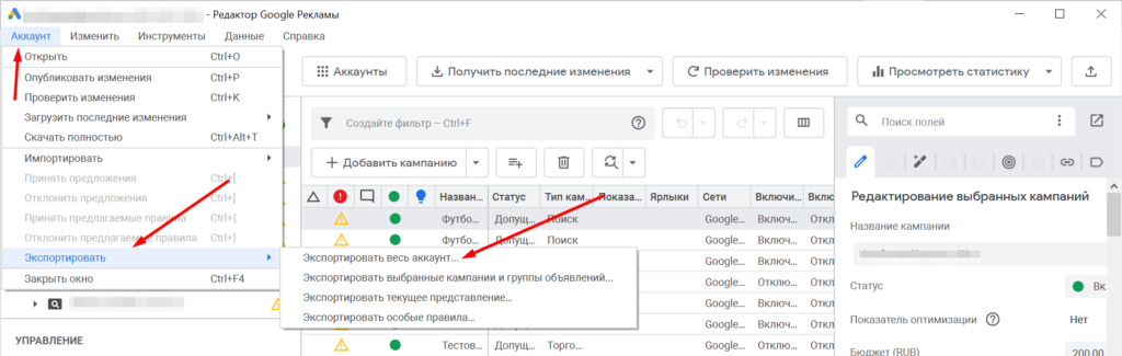 Чтобы создать резервную копию аккаунта, понадобится приложение Google Ads Editor. Войдите в программу, откройте меню «Аккаунт», выберите пункт «Экспортировать» → «Экспортировать весь аккаунт…».
