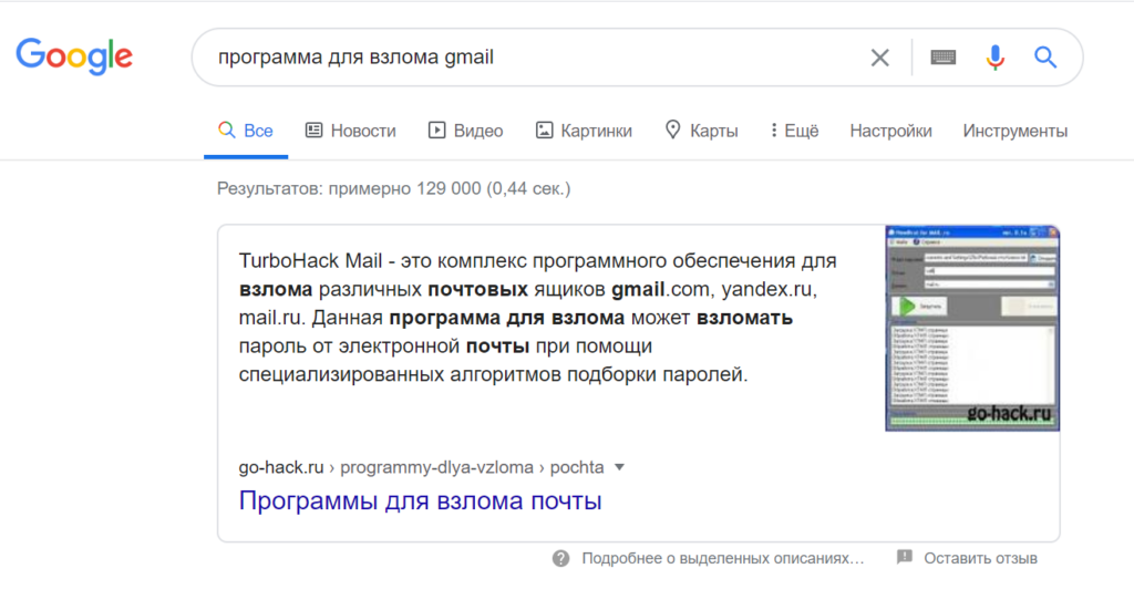 Подборка программ для взлома Gmail в Google-поиске — даже с расширенным сниппетом