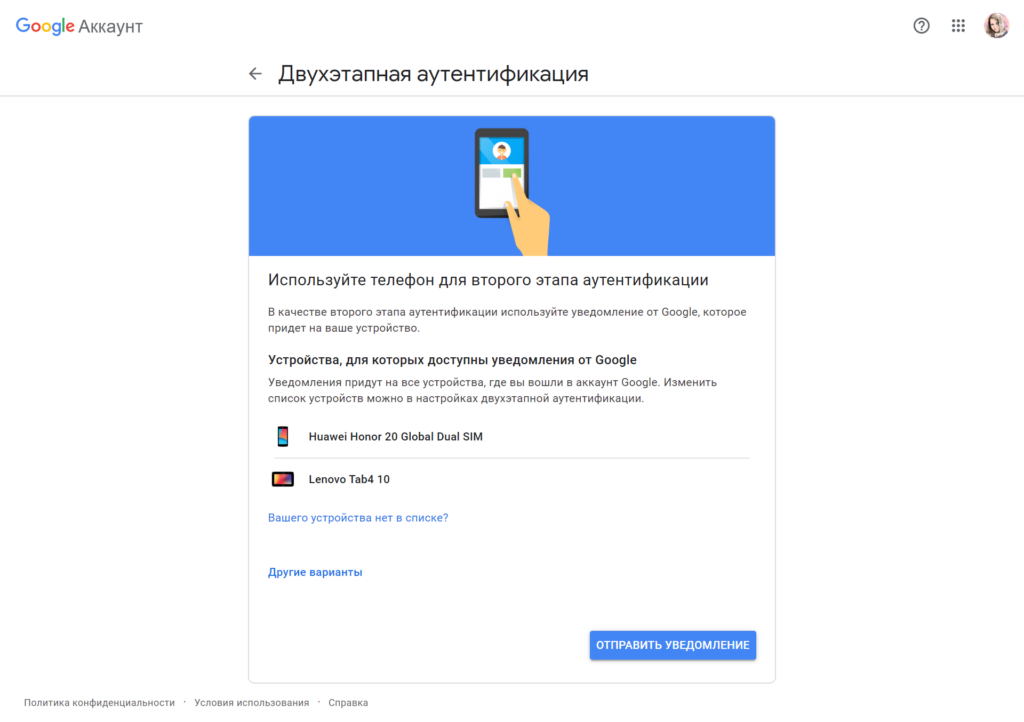 После настройки аутентификации при каждом входе система будет отправлять на эти устройства уведомления для подтверждения входа.