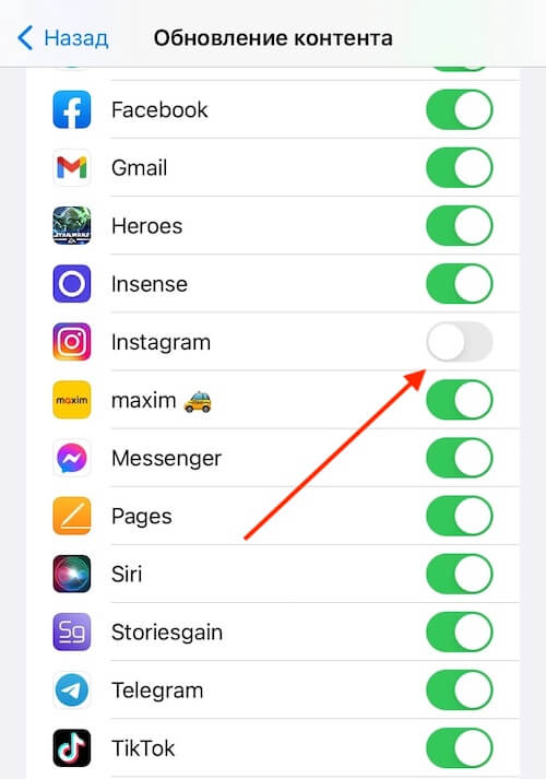 Чтобы снова включить обновление Инстаграм, действуйте аналогичным образом, только выбирайте включить.