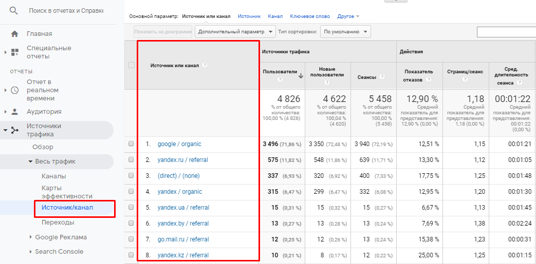 Зайдите в аккаунт, найдите в разделе «Отчеты» пункт «Источники трафика». Далее кликните на «Весь трафик» и выберите «Источник/канал».