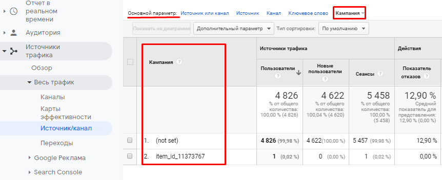 Для получения данных по кампаниям (utm_campaign) установите основной параметр — «Кампания».