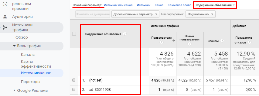 Для получения данных по ссылкам в объявлении (utm_content) установите основной параметр — «Содержание объявления».