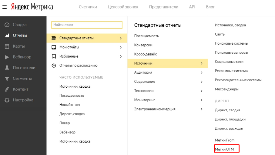 Для просмотра отчетов по UTM–меткам выберите раздел «Отчеты», далее кликните на «Стандартные отчеты» и найдите пункт «Метки UTM».