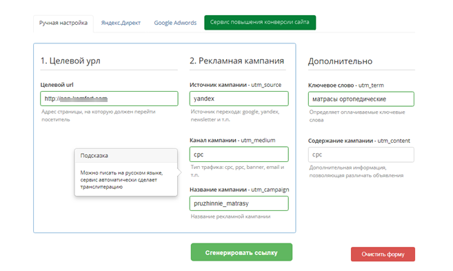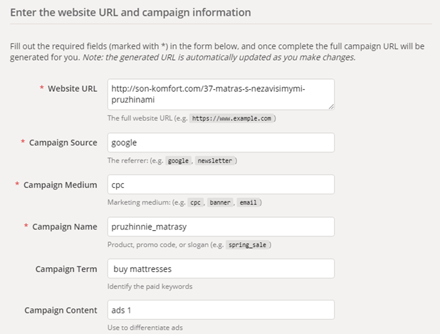Этот сервис разработан Google. Заполните все обязательные поля: целевой URL, источник перехода, тип трафика, название кампании. Задайте опциональные UTM-метки.