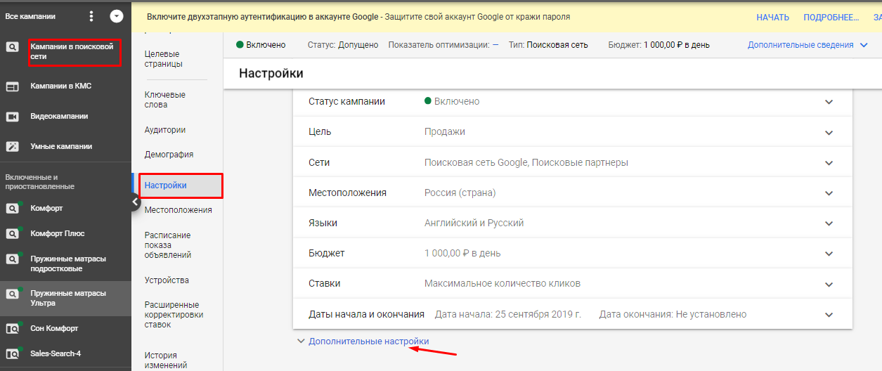 1. Для добавления шаблона для новой кампании в разделе «Настройки» выберите пункт «Дополнительные настройки».