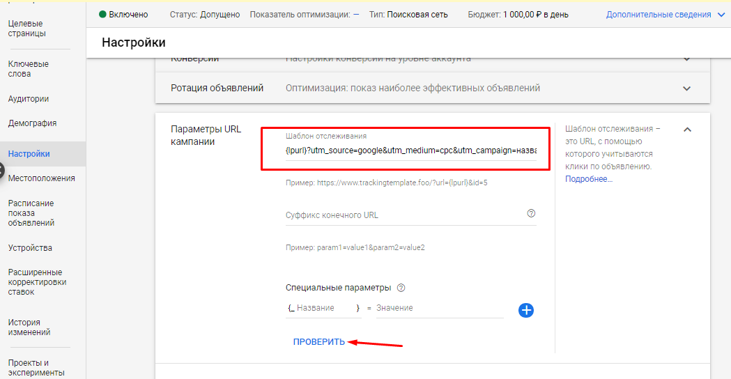 2. В открывшемся списке выберите пункт «Параметры URL кампании». В строку «Шаблон отслеживания» введите ссылку с UTM-метками.