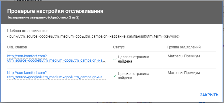 После нажатия на кнопку «Применить» к объявлениям выбранных кампаний будут применяться шаблоны с UTM-метками.