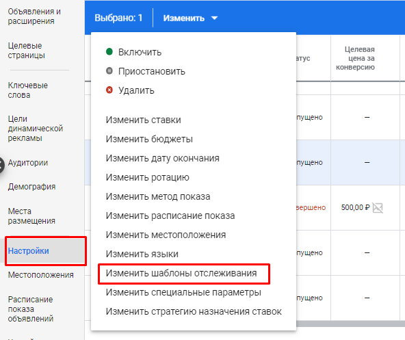 1. Перейдите в раздел «Настройки» и выделите кампанию, для которой меняется шаблон. Выберите пункт «Изменить шаблоны отслеживания».