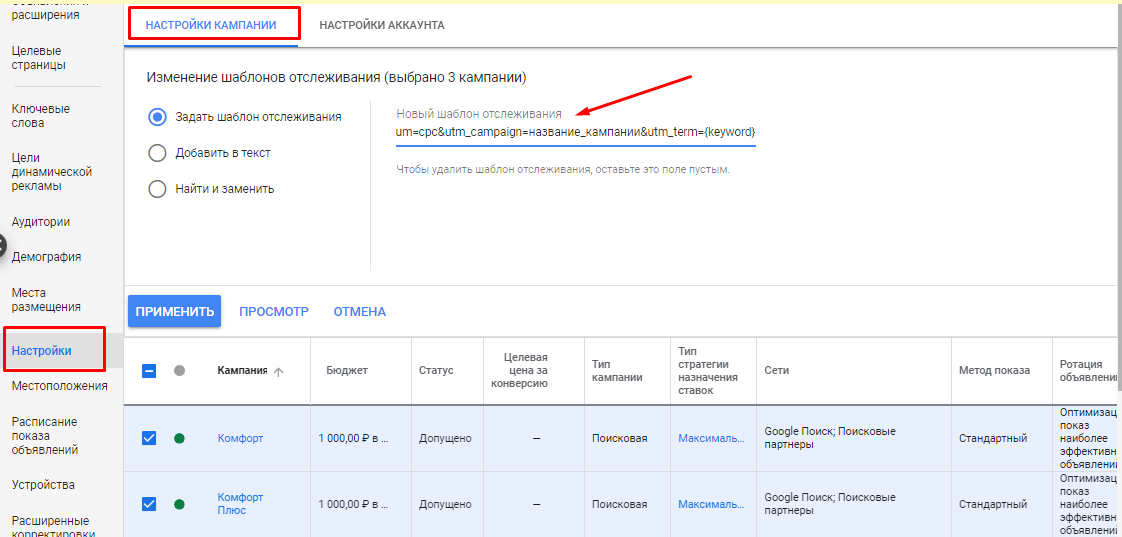 2. Выберите пункт «Задать шаблон отслеживания». В строку «Новый шаблон отслеживания» введите сформированную ранее ссылку с UTM-метками. Далее выберите кампании, к которым будут применяться изменения.