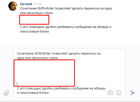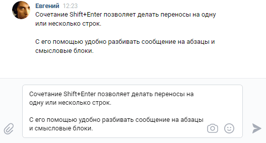 По умолчанию у всех пользователей ВК кнопка ввода отвечает за отправку сообщений. Для того чтобы сделать перенос курсора, нужно использовать одно из двух сочетаний клавиш.