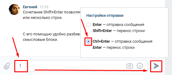 Сделать это очень просто. Зайдите в любой диалог и начните набирать что-нибудь. Достаточно ввести в окне редактора любой символ, букву или цифру, чтобы значок записи аудиосообщений (которые можно скачивать) изменился на значок самолетика. После этого наведите курсор мыши на этот самолетик и держите до появления всплывающего окошка настроек. В этом окне выберите нужный режим отправки, установив переключатель на нужную вам комбинацию.