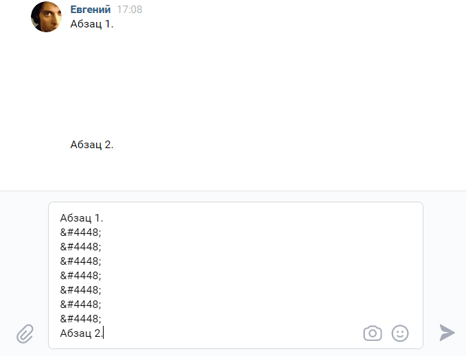 ВК не позволяет добавить сколь угодно большой разрыв между абзацами. Поэтому для его добавления мы будем применять спецсимволы или HTML-мнемоники, которые пользователи соцсетей называют просто “коды пустоты” или “коды пробела”.