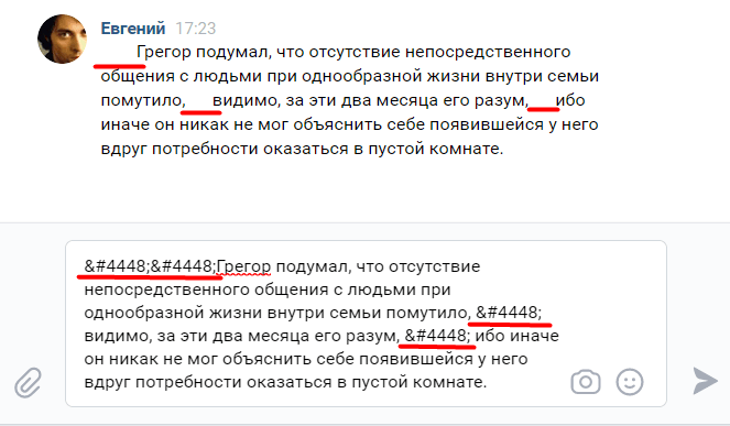 Пользоваться ими очень просто. Скопируйте один из кодов, начиная с символа “and” и заканчивая “;”. Вставьте мнемонику между абзацами, которые хотите разделить. Вставлять нужно столько раз, сколько пустых строк вы хотите получить. В редакторе спецкод будет отображаться, а вот в переписке будет невидимым.